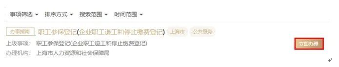 在搜索结果中找到“职工参保登记(企业职工退工和停止缴费登记)”,点击右侧的“立即办理”,即会跳转至办理页面。