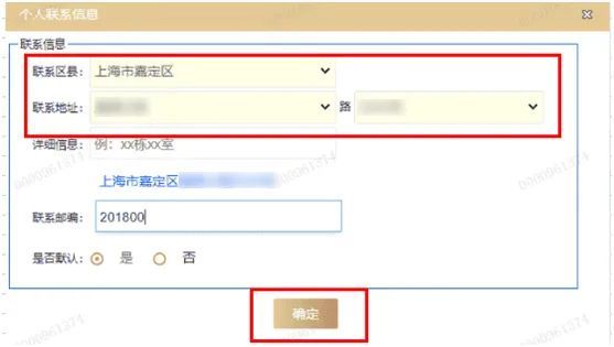 录入时标记黄色的“区县”、“XX路”、“XX号”字段需通过输入关键字后从下拉框中点选的方式录入(如:录入上海市黄浦区,可在框中录入“黄浦”,再从下拉框中点选“上海市黄浦区”),编辑完成后点击“确定”按钮。