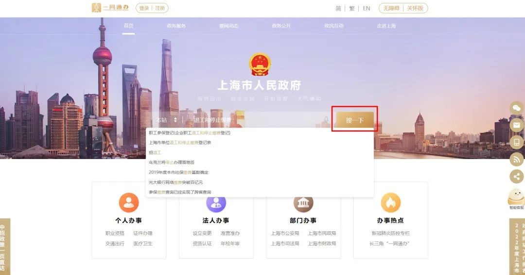 您可登录“一网通办”首页,在搜索框中输入“退工和停止缴费”,点击“搜一下”。