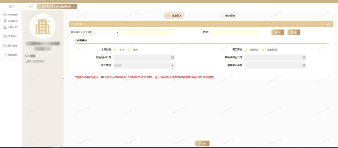 分步录入“退工原因”和“解除或终止日期”后,点击“下一步”。