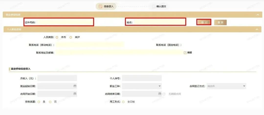分别录入需办理员工的证件号码和姓名,点击“登记”,系统将自动显示默认的联系信息。
