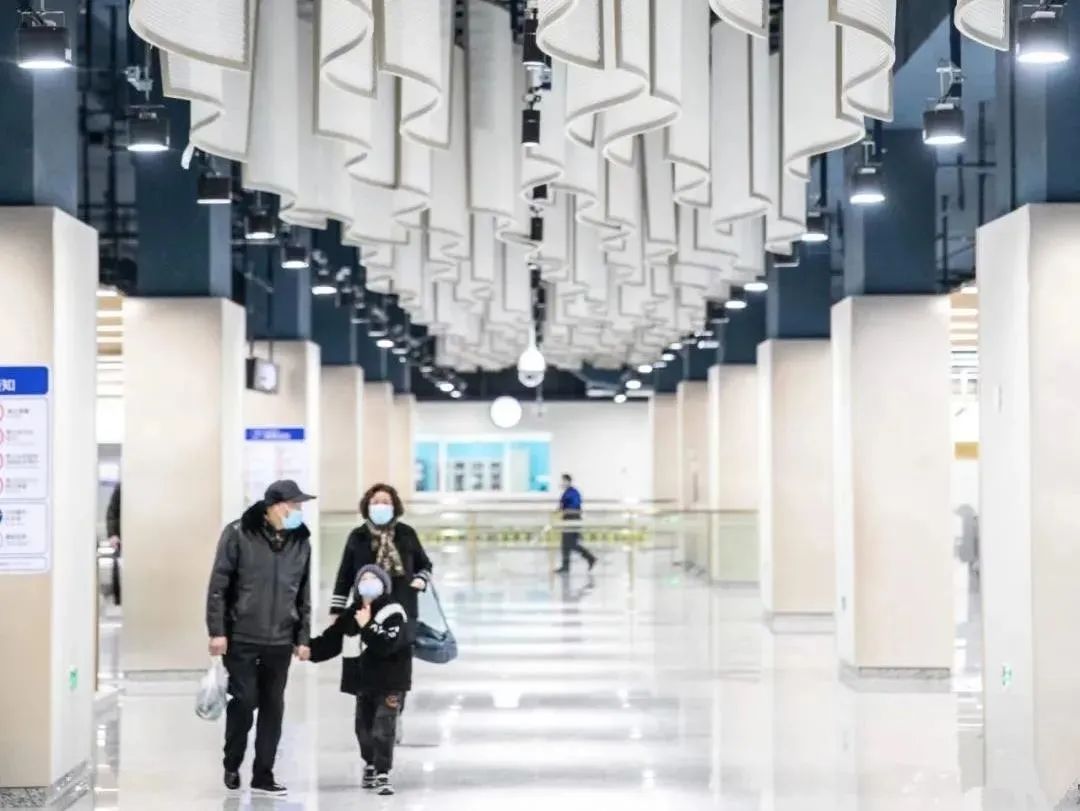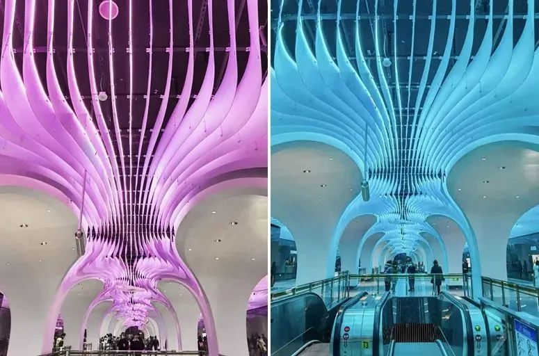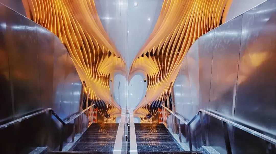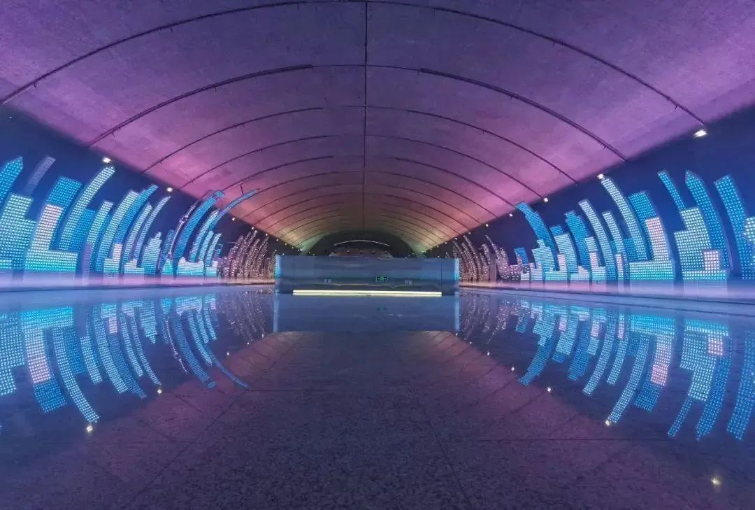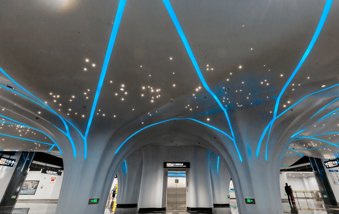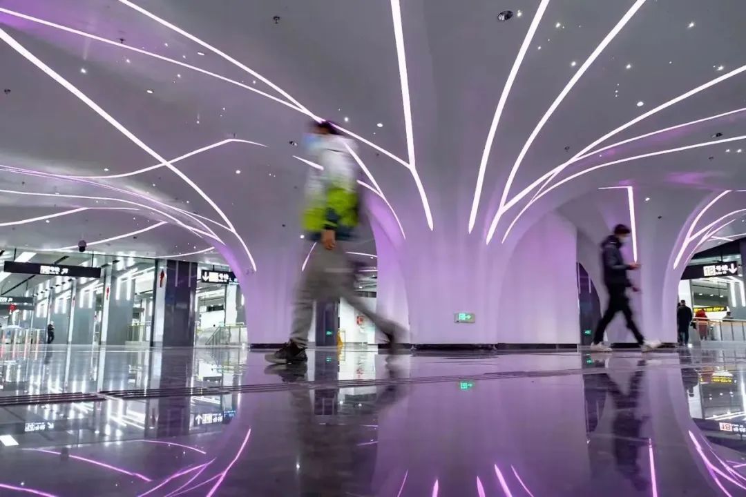地铁14号线豫园站的站内大厅,也被称为“上海脉搏”。车站的顶部设计有蜿蜒曲折的褶皱灯带,层层铺设开来,形成一个超大的LED三维屏幕。在不同时间里,装饰灯光也会变幻出橙、紫、蓝、白等多种色彩,将空间艺术和光影艺术完美融合在一起,创造出一个个神奇而梦幻的立体空间。