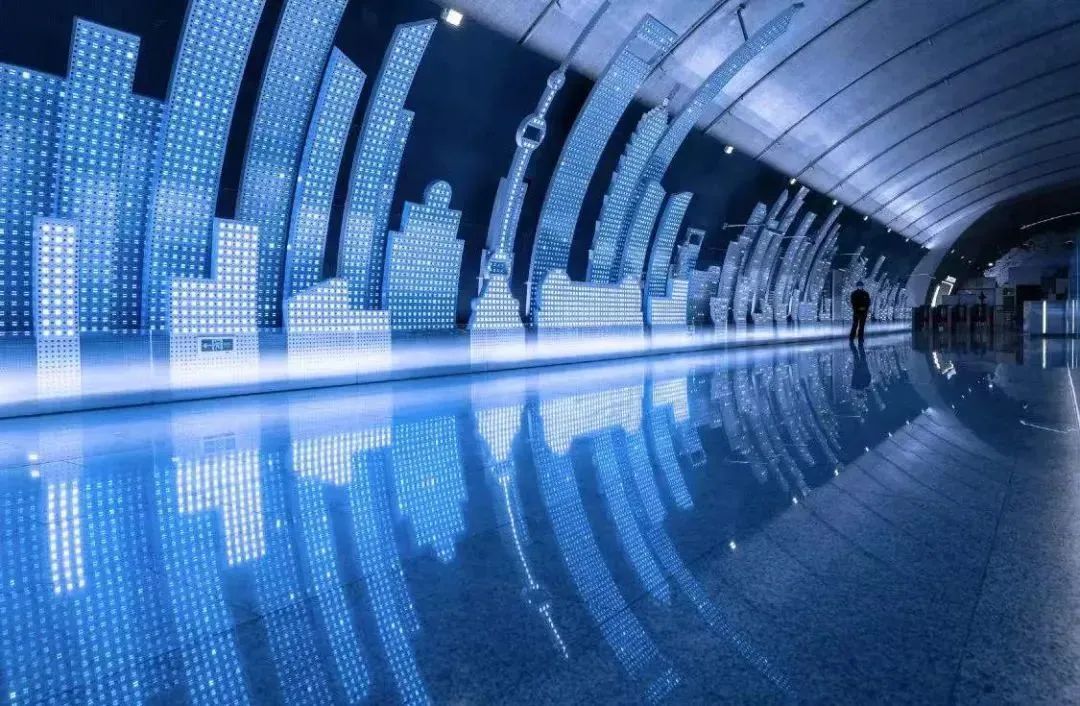 站厅中最引人注目的设计,则是两侧展示上海城市景观的景墙。一幅长达70多米的画卷,通过LED灯带将浦江两岸的天际线动感呈现,乘客穿过地铁站的长廊,就像穿过一个展示上海改革开放城市建设的华丽展厅。