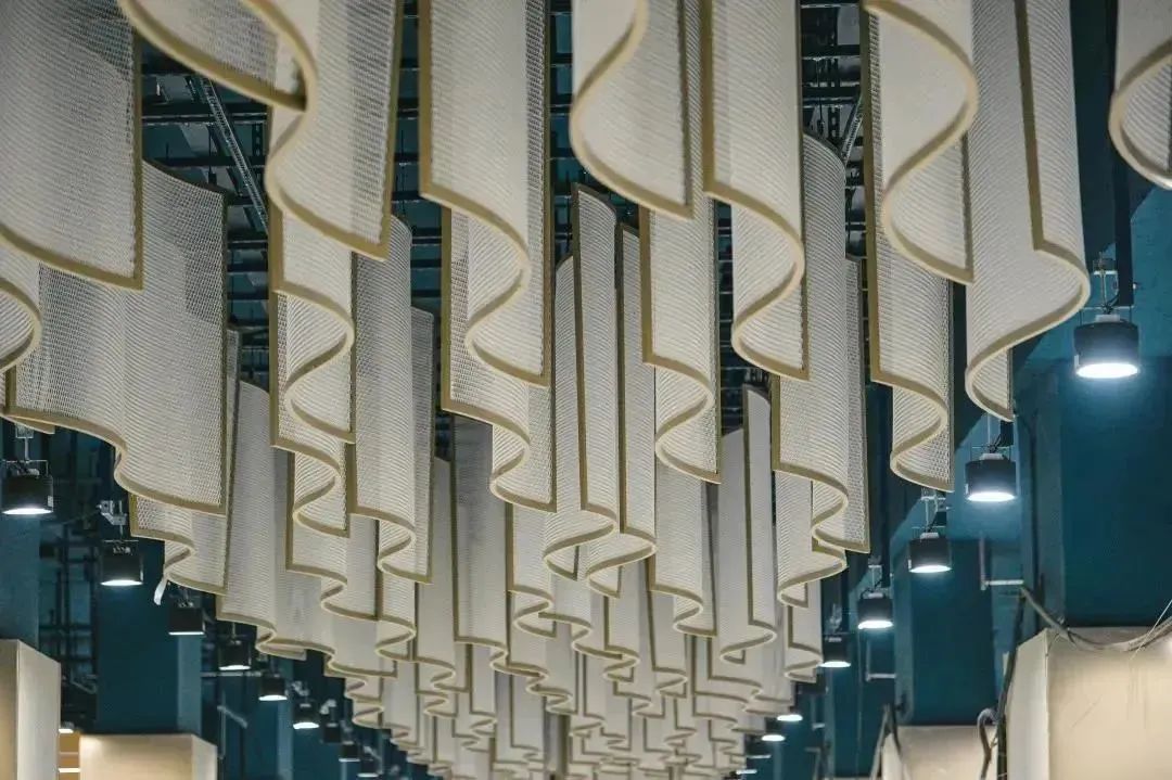 地铁15号线长风公园站地名出自:“愿乘长风破万里浪”,所以地铁站的设计中也融入了山水的元素。蓝白色调的波浪吊顶像是蜿蜒流动的河水,很有动感,也为长风公园地铁站带来一丝清爽。
