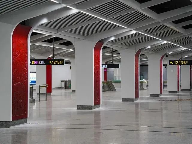 地铁14号线曹杨路站以“工运脊梁”为主题,设计师用门式钢架造型隐喻蕴育出沪西工人运动的纺纱车间形象。白色的门架梁内局部嵌入了红色的片板,并在其上印刻革命历史典故和工人运动事迹,当一幅幅印刻着革命历史典故和工人运动事迹的红色片板浮现在乘客的面前,一部关于老上海人回忆之书也随之展开。