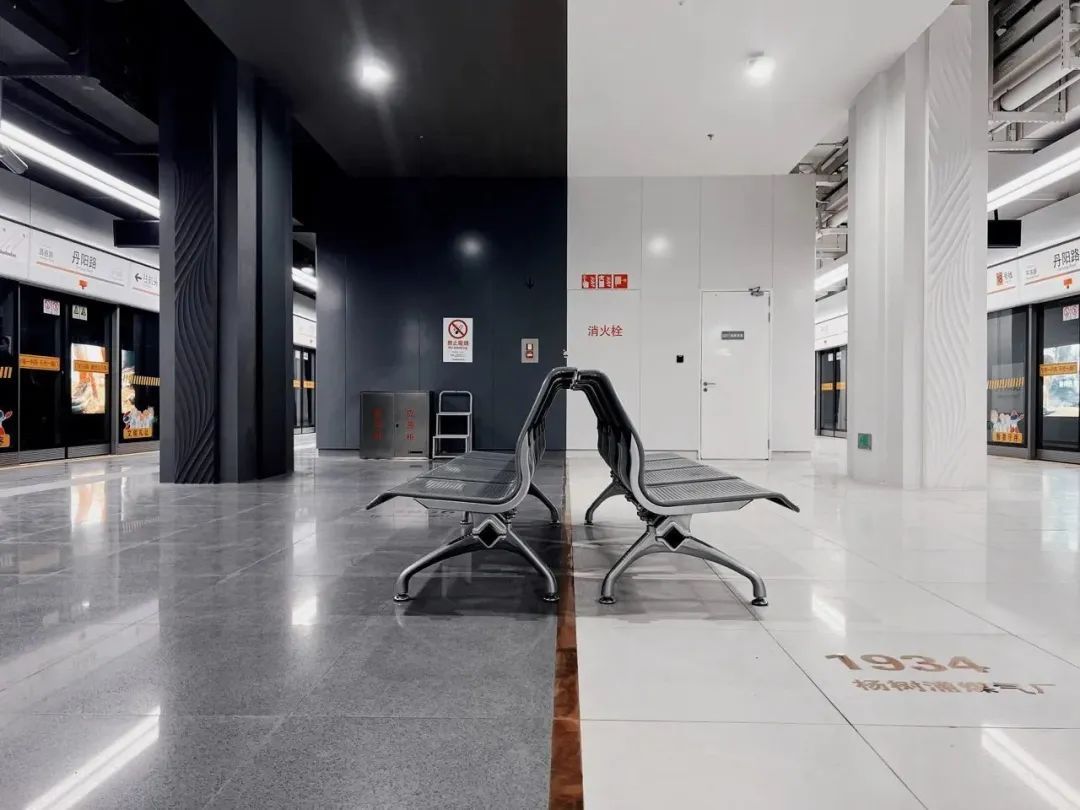 地铁18号线丹阳路站太适合拍大片了!整个地铁站的用色非常简洁,只有黑白两色,代表了“今”与“昔”。无论站厅,还是站台,均以中心线一分为二,即楼梯一段黑色,一段白色。