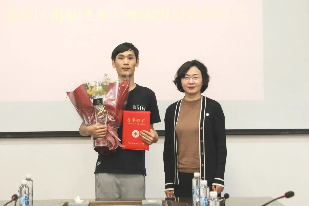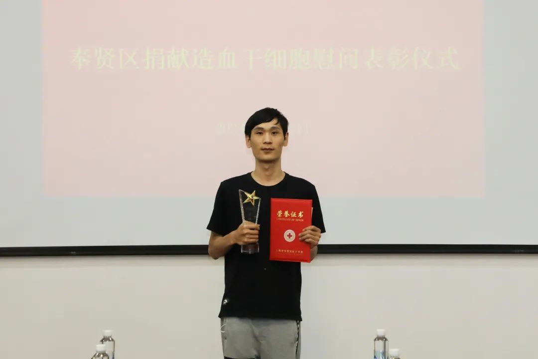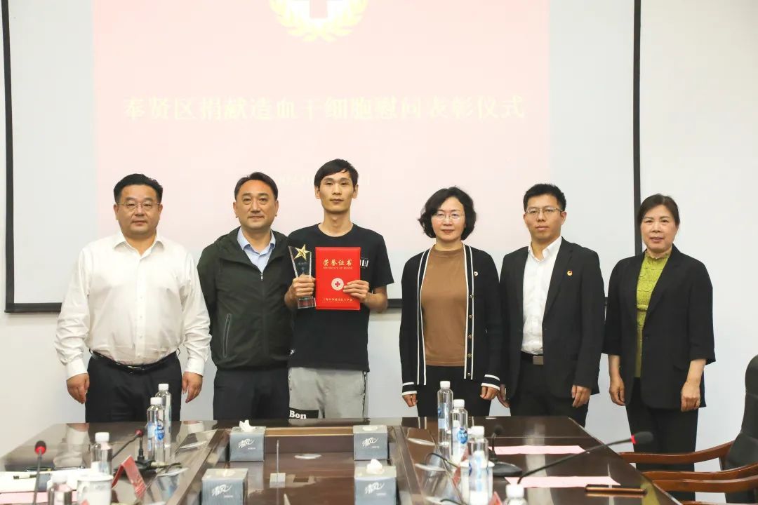 区红十字会为捐献者颁发奉贤区“贤城博爱之星”证书、奖杯。