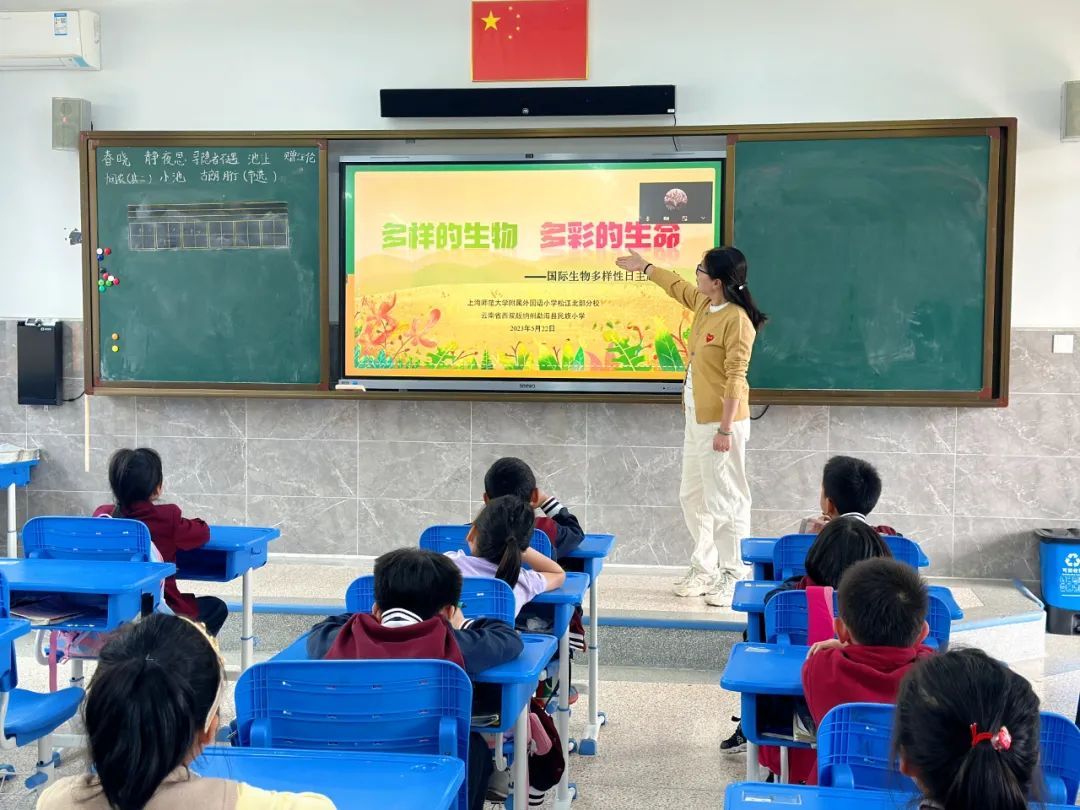 5月22日是第23个国际生物多样性日,上海师范大学附属外国语小学北校与云南西双版纳傣族自治州勐海县民族小学借助于信息化设备“同上一堂课”。两校学生扮演小小生物讲解员,在特别的日子点亮“多样的生物,多彩的生命”这一学习主题。