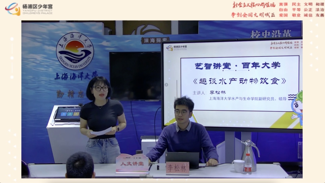 5月14日,“百年大学 人文讲堂”(第七季)如期举行。上海海洋大学水产与生命学院副研究员、硕导李松林老师,与线下来自民办打一外国语小学、同济小学、内江路第二小学、育鹰学校、同济第二初级中学的中小学生及线上1600余名青少年观众,一起探寻水产动物的健康饮食。