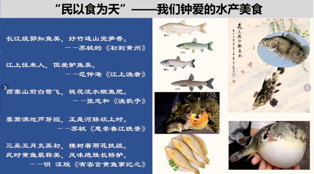 “西塞山前白鹭飞,桃花流水鳜鱼肥。”“蒌蒿满地芦芽短,正是河豚欲上时……”诗词里流露出古人对于水产美食的钟爱。李老师与大家分享了古诗词、经典文学作品中的水产动物,并告诉大家中国水厂养殖有着悠久的历史。