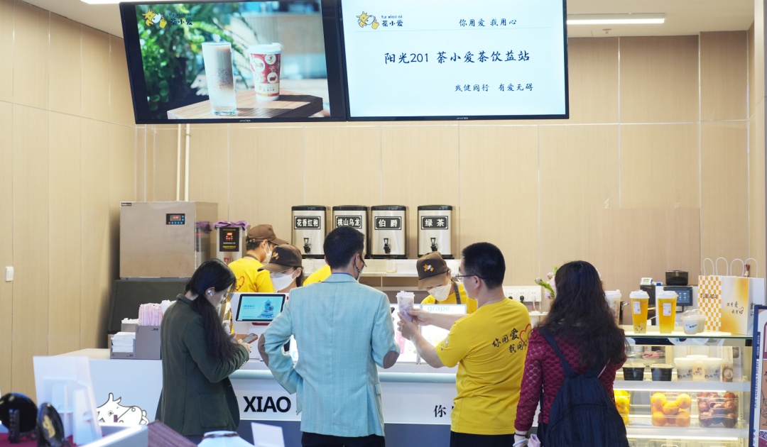 怀抱吸管杯的奶牛logo、亮眼的黄色制服、吸睛的大幅留言墙……近日,一家已经在金山小有名气的奶茶店,出现在了位于静安区的上海市残疾人就业服务中心大楼里,正式成为了“阳光201”残疾人就业服务综合平台的一员。从尝试着运营第一家门店到入驻服务全市残疾人就业工作的中心枢纽,这段路,陆学峰与妻子王利携手走了2年多,随着新店的开业,他们,离“5年拓展到50家门店,实现100位残疾人就业”的目标又近了一步。