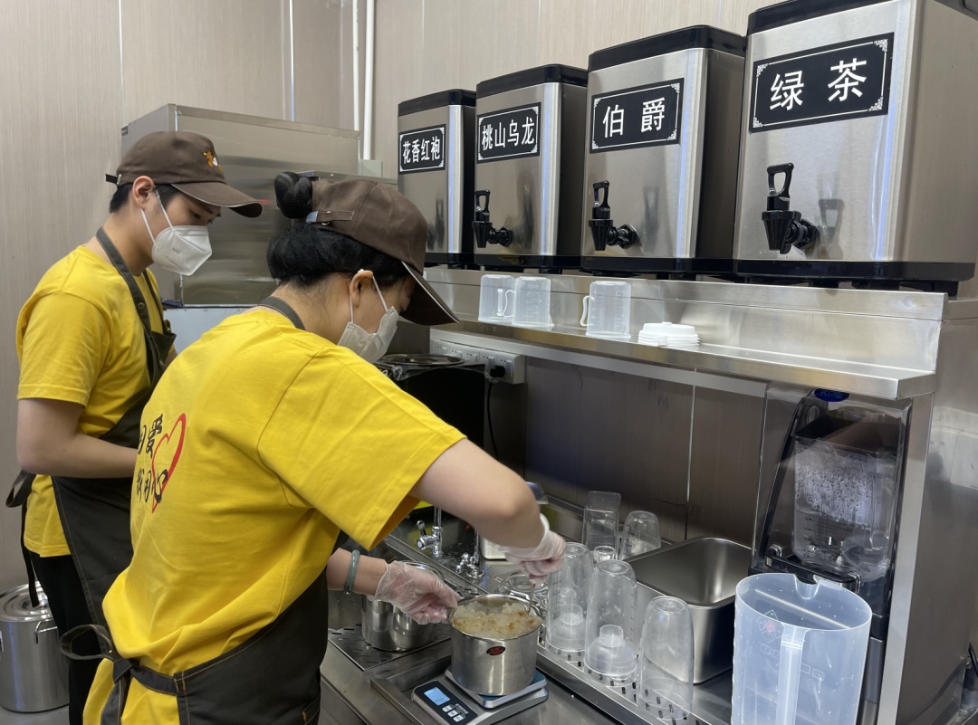 与运营于金山区的4家门店相同,在上海市残疾人就业服务中心内的这家“荼小爱”依旧采用的是“2+2”的店员结构,即两名健全员工加两名心智障碍员工。刚开业两日,客流量超出了陆学峰的预估,平均1小时30多杯的出单量对其它奶茶店或许游刃有余,但对于“荼小爱”来说却是一个不小的挑战,为了不让顾客等太久,陆学峰帮着打起了下手,身为高级茶艺师的王利则负责核对整个流水线的运作。原材料的比例是否正确,冰沙打得时间够不够,鲜果打汁的手法对不对,如有不到位,她会马上叫停纠正。