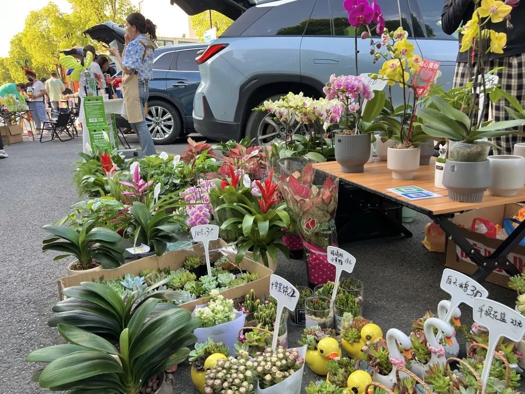 集市现场摆放出的商品琳琅满目,“520”的氛围相当浓郁。鲜花盆栽、手冲咖啡、动漫玩偶、生活小件等,吸引了不少市民驻足购买。
