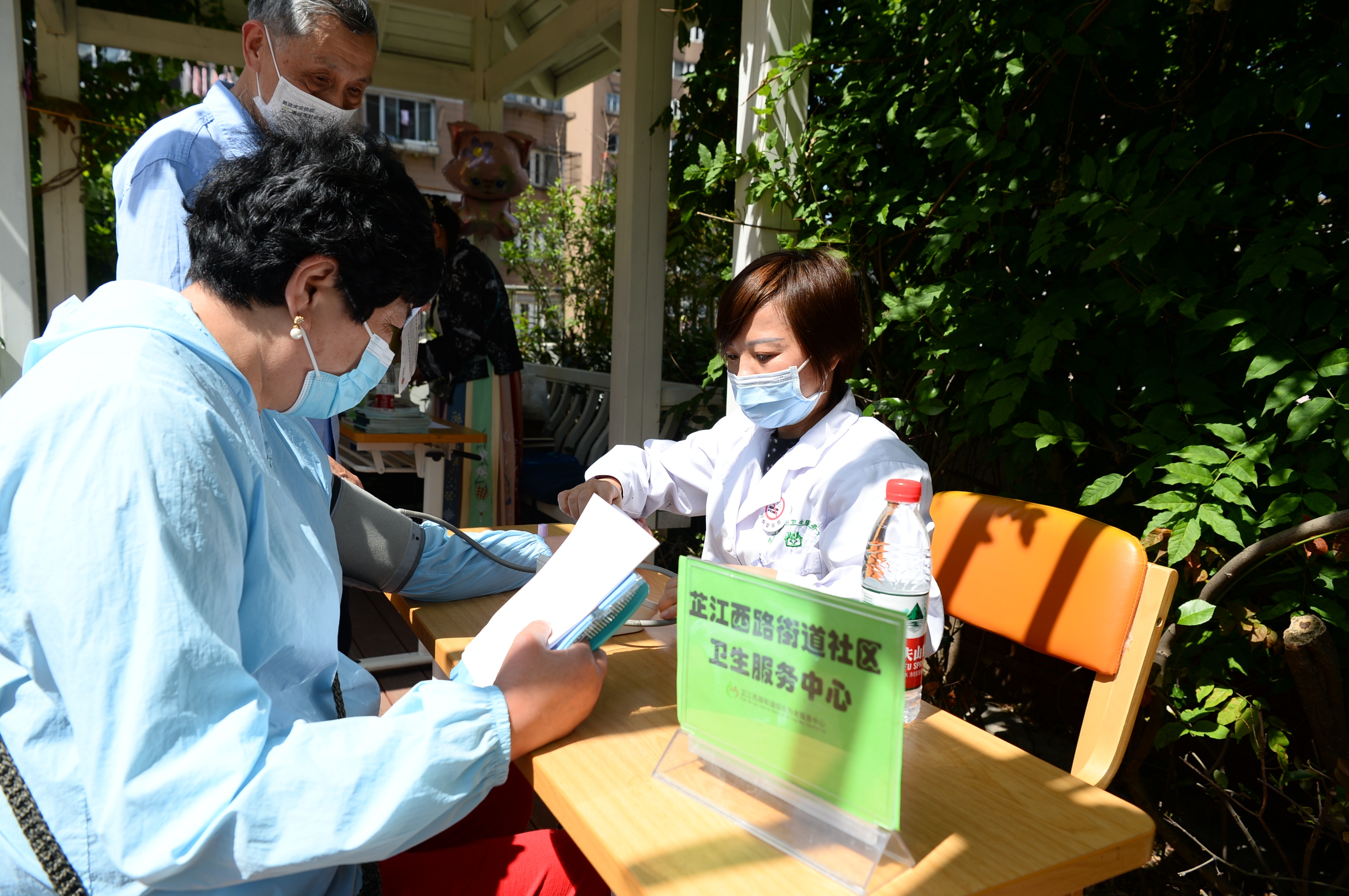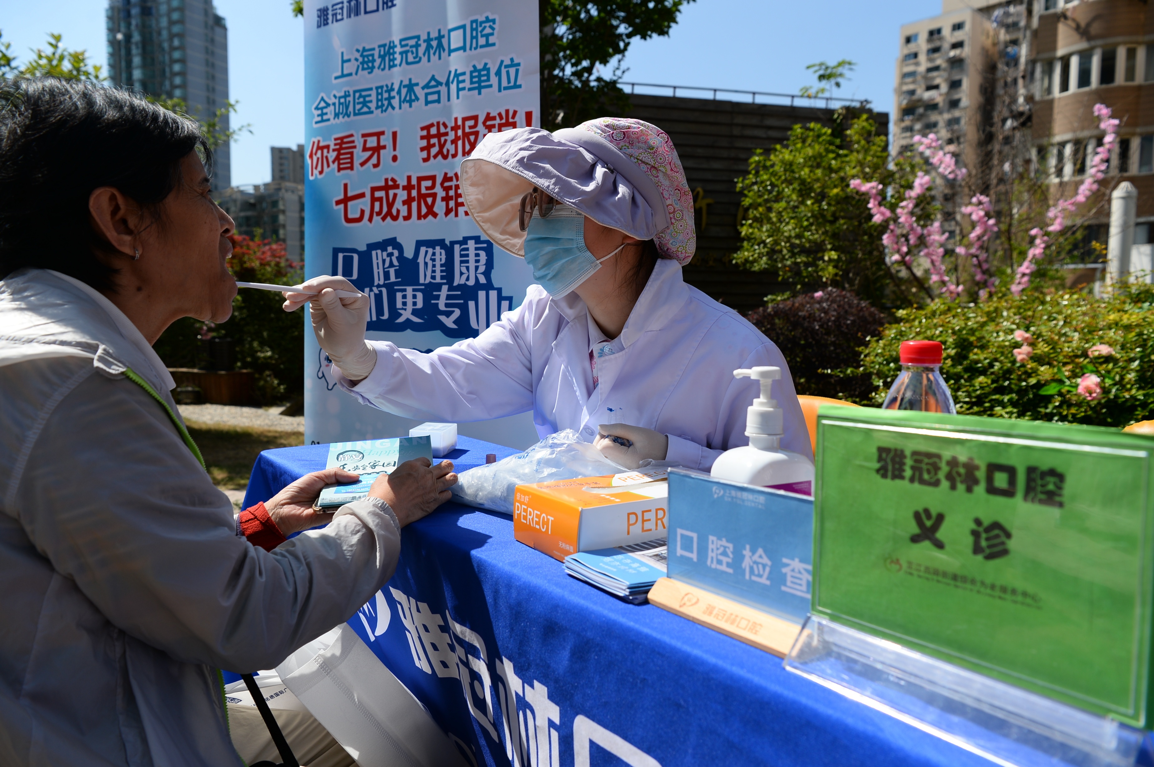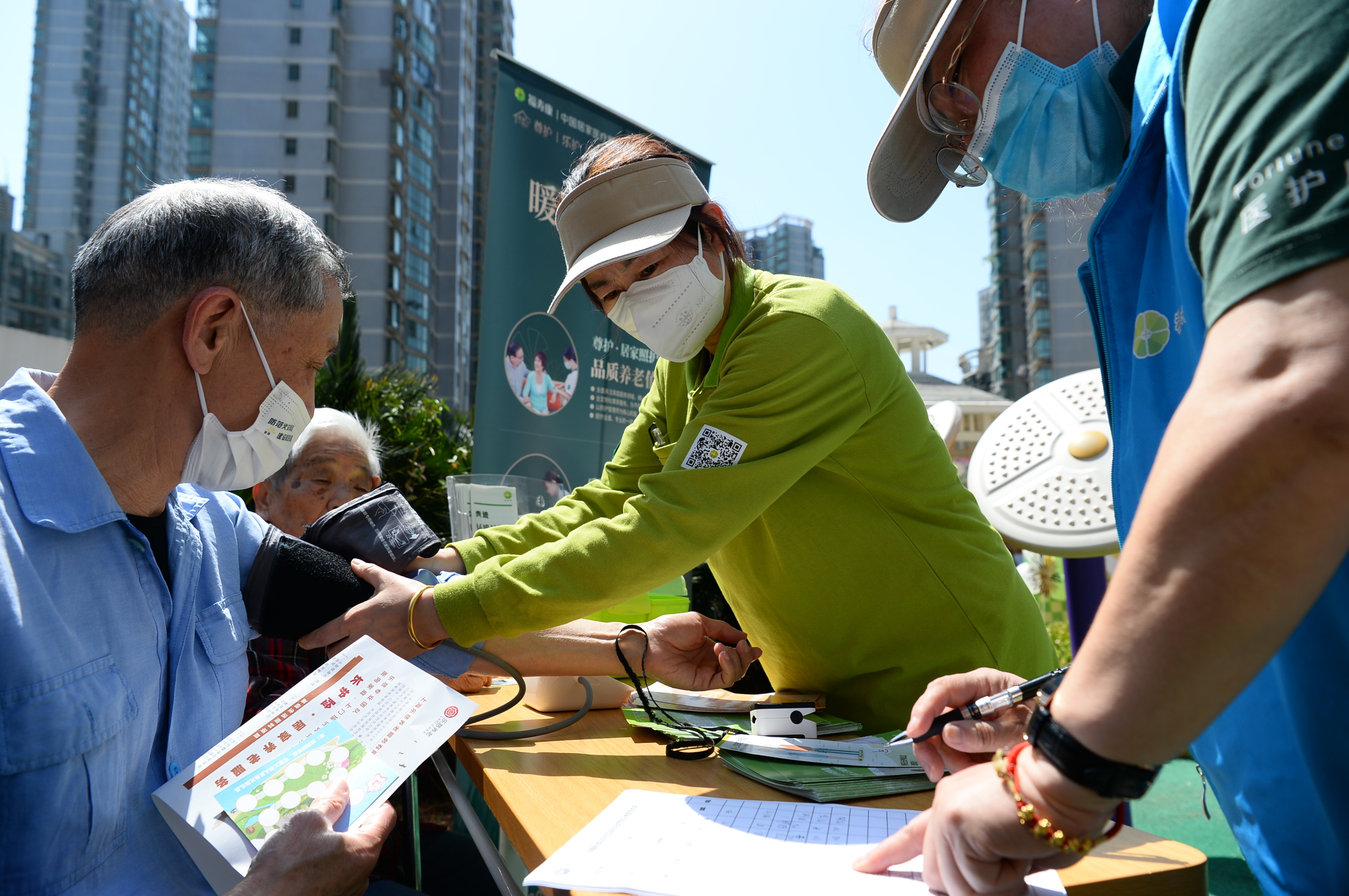在芷江西路综合为老服务中心3楼的天台花园上,15个公益服务点位依次摆开,提供多项志愿服务,主要包括老年协会的助老服务项目推介、街道社区卫生服务中心的健康义诊、乐慈养老的老年课堂、乐慈爱老的长者照护之家、居委适老化改造介绍、静安区随身办市民云、居家养老的政策咨询和车轮助餐、雅冠林口腔义诊、福寿康日间照料中心、建社家的老年人健康咨询、老年人意外险咨询等。