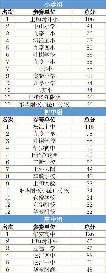 松江区各中小学共86个代表队,2500余名运动员在比赛中团结协作、奋勇拼搏。经过激烈的角逐,上师附外小、中山小学、九亭二小夺得小学组团体总分前三名;松江七中、九亭中学、叶榭学校夺得初中组团体总分前三名;华实高中、上师附外中、立达中学夺得高中组团体总分前三名。