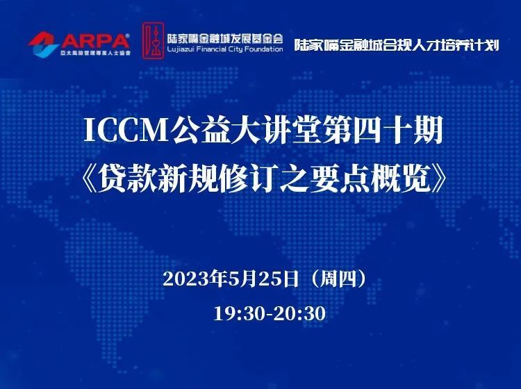 为助力上海市银行业合规示范区的建设,提升陆家嘴区域内专业化人才集聚度,接轨国际合规标准,强化金融机构合规意识,陆家嘴金融城与亚太风险管理专业人士协会(ARPA)共同推出“陆家嘴金融城合规人才培养计划-ICCM公益大讲堂”,第四十期围绕《贷款新规修订之要点概览》主题进行分享。课程以在线课程形式开展,扫描下文中的二维码进入房间,即可免费听课。