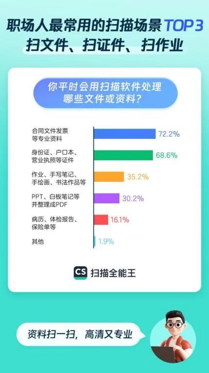 t职场效率提升“黑科技”并非只有生产内容的ChatGPT类软件,还有一些能够精简工作流程的工具,比如扫描类软件。文件录入整理类的工作琐碎又耗时,堪称工作中的“烫手山芋”。《报告》提到,职场人最常使用扫描软件来扫描合同文件、发票等专业资料(占比72.2%),以及身份证、户口本、营业执照等证件(占比68.6%)。