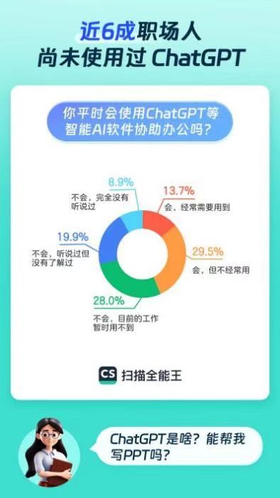 t此外,连着几个月上“热搜”的ChatGPT,竟有超六成受访者称,自己尚未用过ChatGPT类的软件。扫描全能王用户媛媛(化名)表示,虽然ChatGPT类软件能够很快捷地进行文字组织,但其反馈的内容目前还比较偏模式化,在应对专业性较强的题材时用途有限。