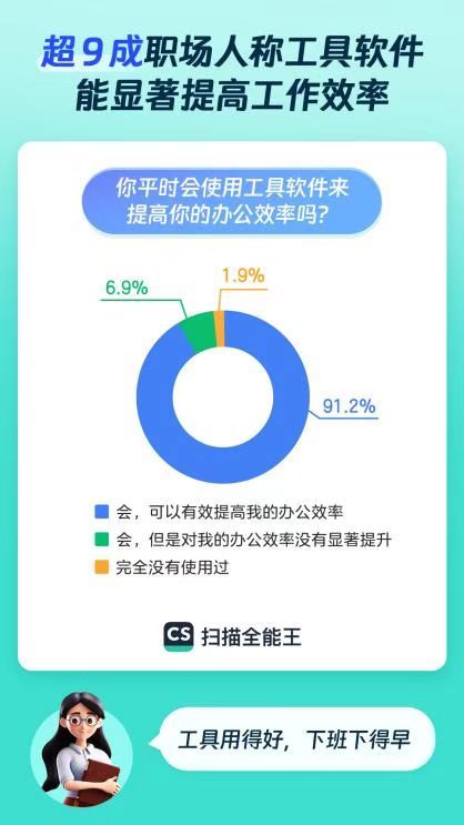 使用工具软件辅助办公,正在越来越多职场人士中盛行。日前,合合信息公司旗下“扫描全能王”平台发布了《当代职场人办公习惯洞察报告》,通过对五百余位职场人士(75%为90后青年)进行了办公工具软件使用习惯调研,结果显示,超九成的受访者表示,工具软件能显著提高工作效率。