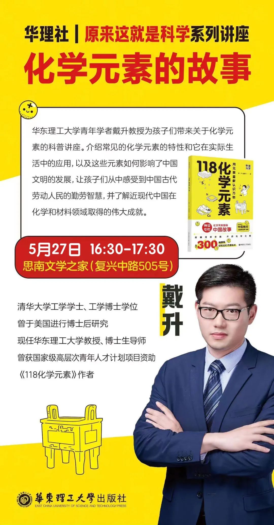 简介:华东理工大学青年学者戴升教授为孩子们带来关于化学元素的科普讲座。介绍常见的化学元素的特性和它在实际生活中的应用,以及这些元素如何影响了中国文明的发展。希望通过此次讲座能够进一步提升青少年学生的科学素质以及文化自信。