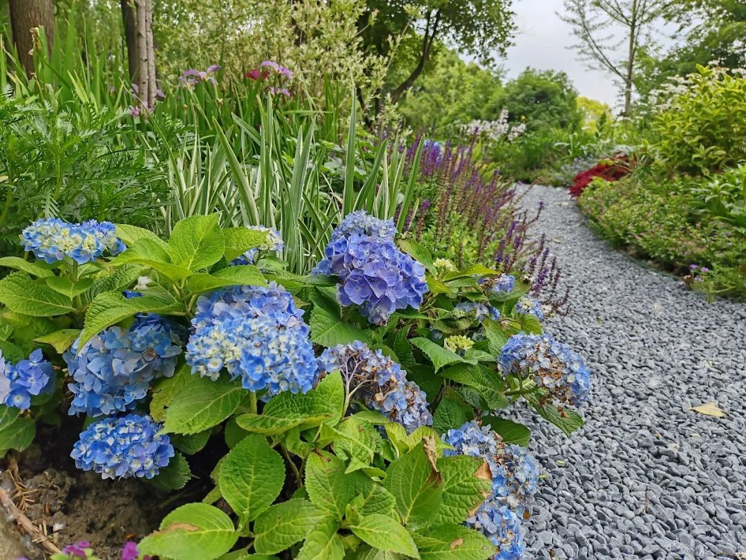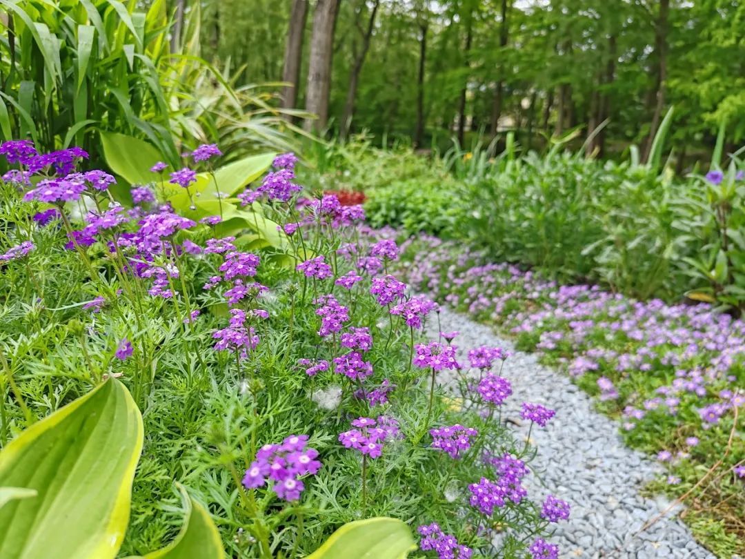 由仙霞西路入口进入步道,走过驿站,不远处就到了这个“秘密花园”。沿着白色的石子小路进入,“秘密花园”里的夏日气息扑面而来,紫色、粉色、蓝色等花卉沿路绽放,让人忍不住前往探究。