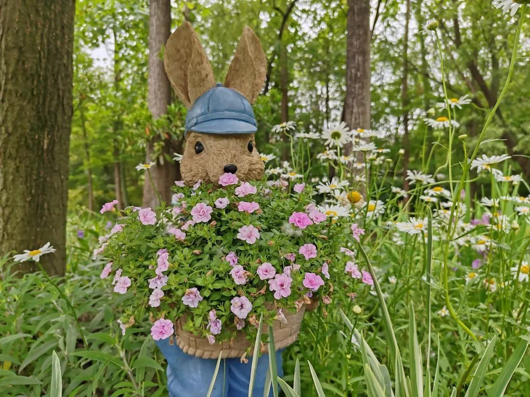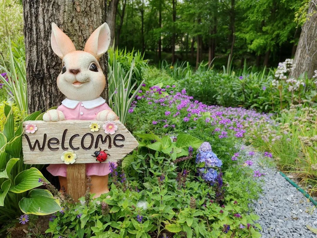 “秘密花园”里有几处可爱又充满神秘感的兔子形象,入口处有“欢迎兔子”,花园里还布置了背着花筒和举着捧花的兔子,它们自然而然地融入花园里,带你移步易景领略这个小花园的美妙之处。