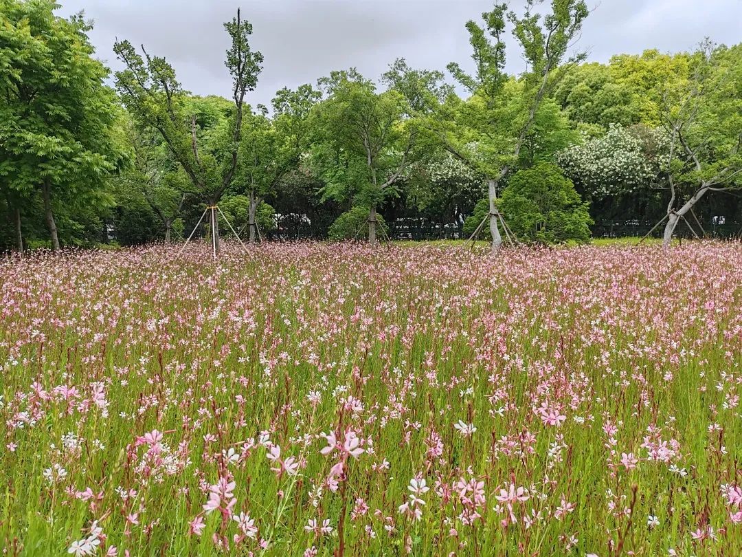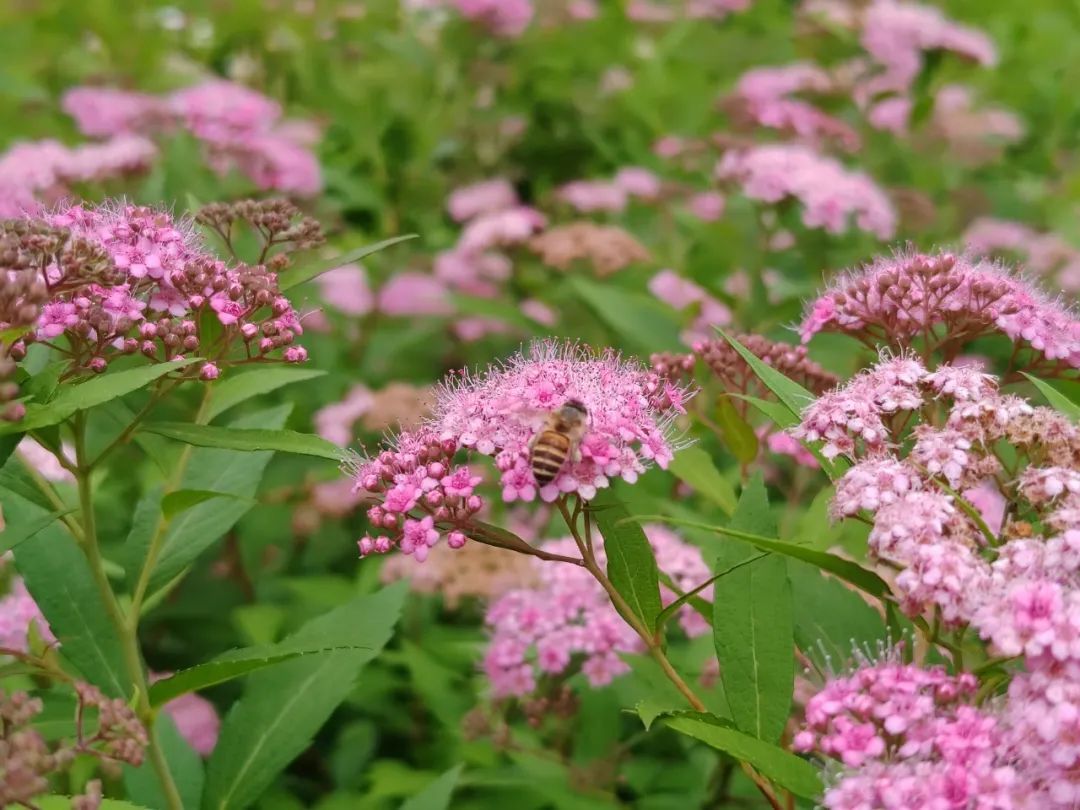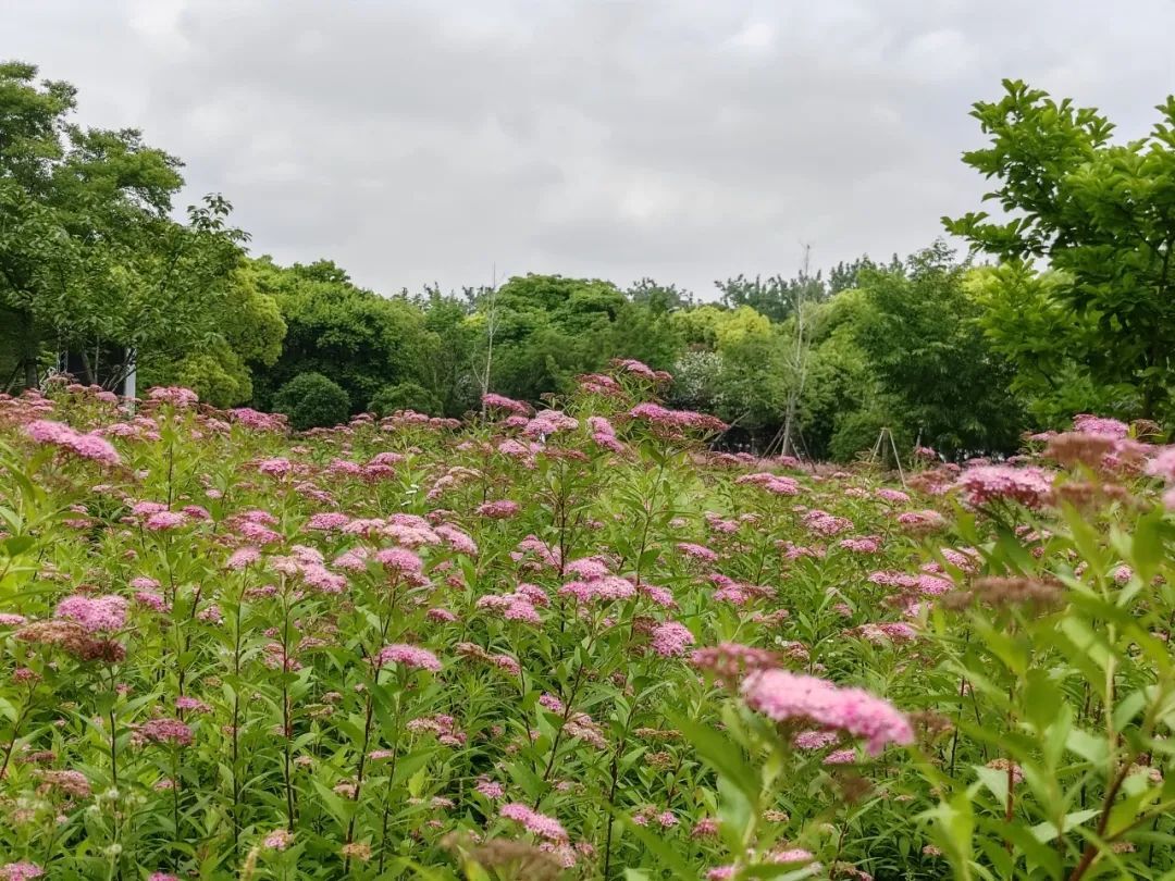 “秘密花园”对面是一片大草坪,这个季节,大草坪里粉色绣线菊、千鸟花等粉色小花连绵成片,粉花小花与秘密花园互为映衬,成为外环林带生态绿道一道唯美与灵动的风景,也为绿道里的骑行者和跑步者打造了一处可以驻足观赏的景点。