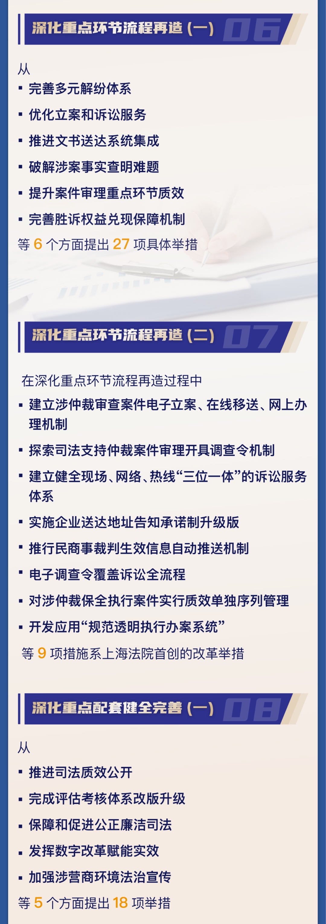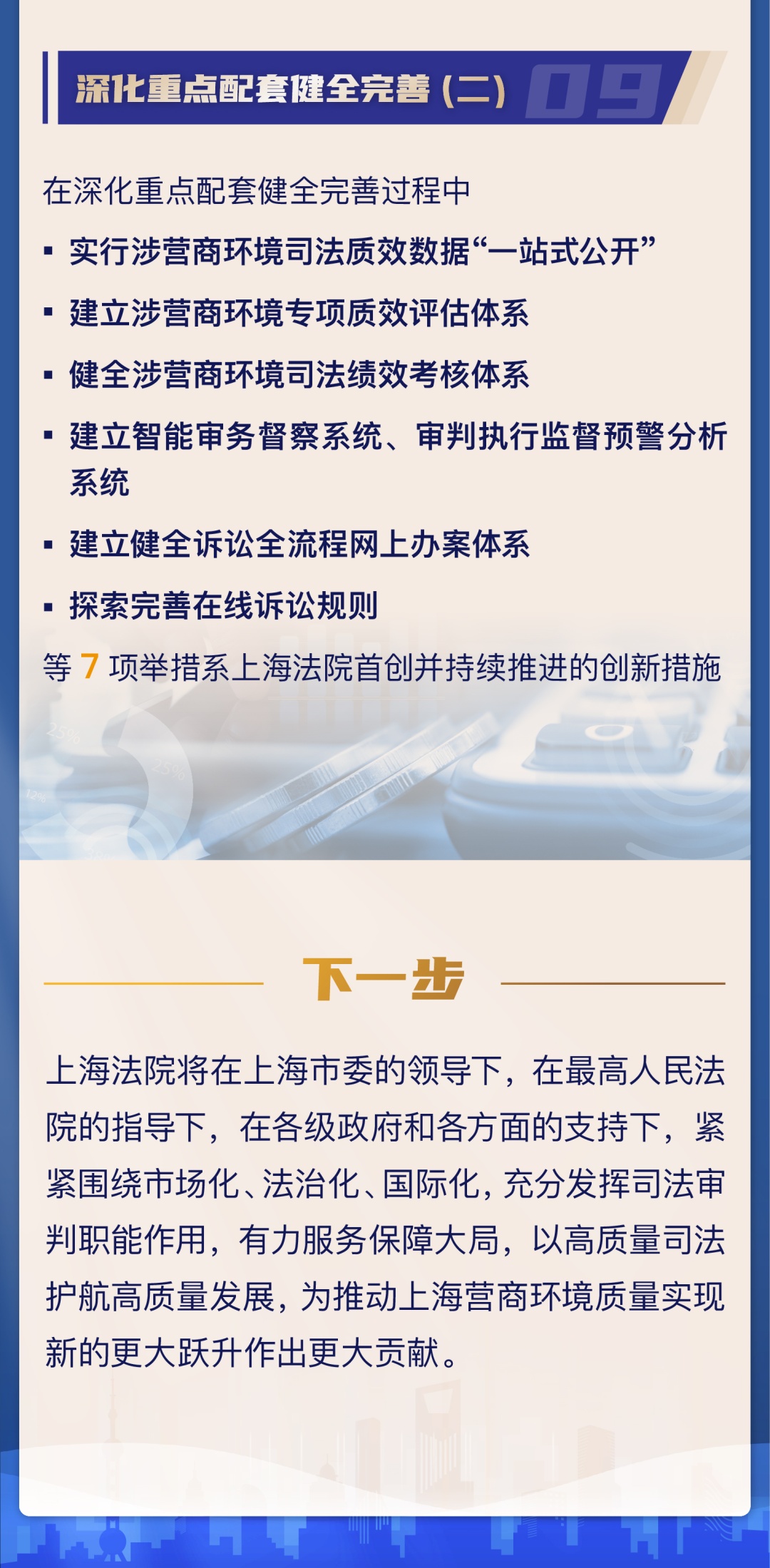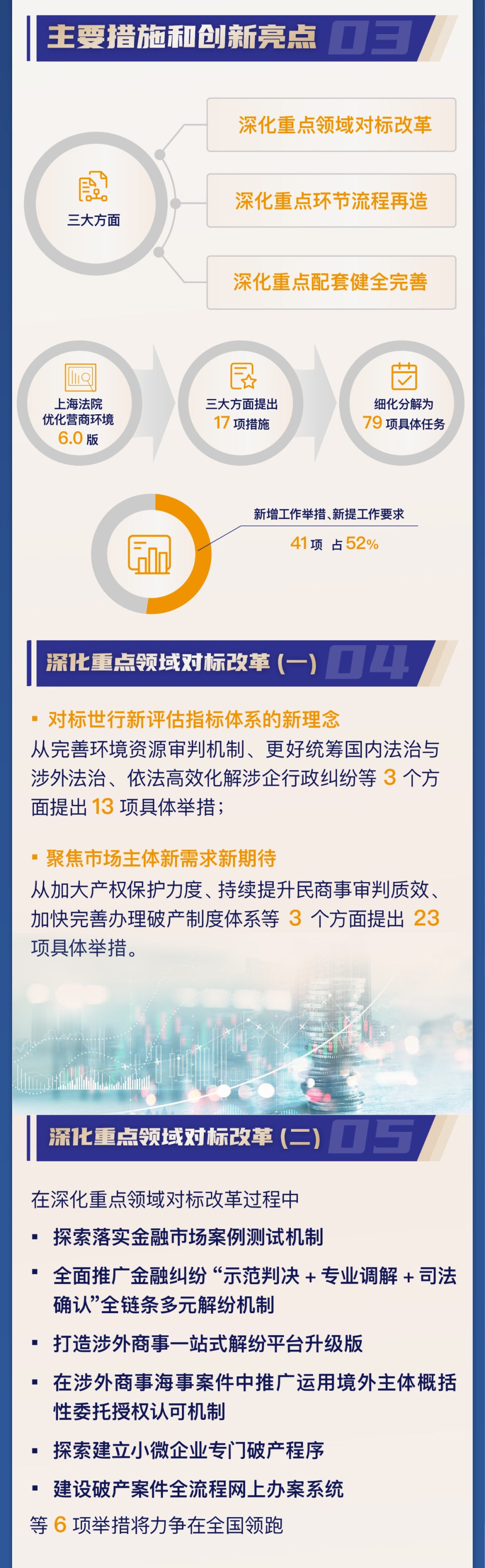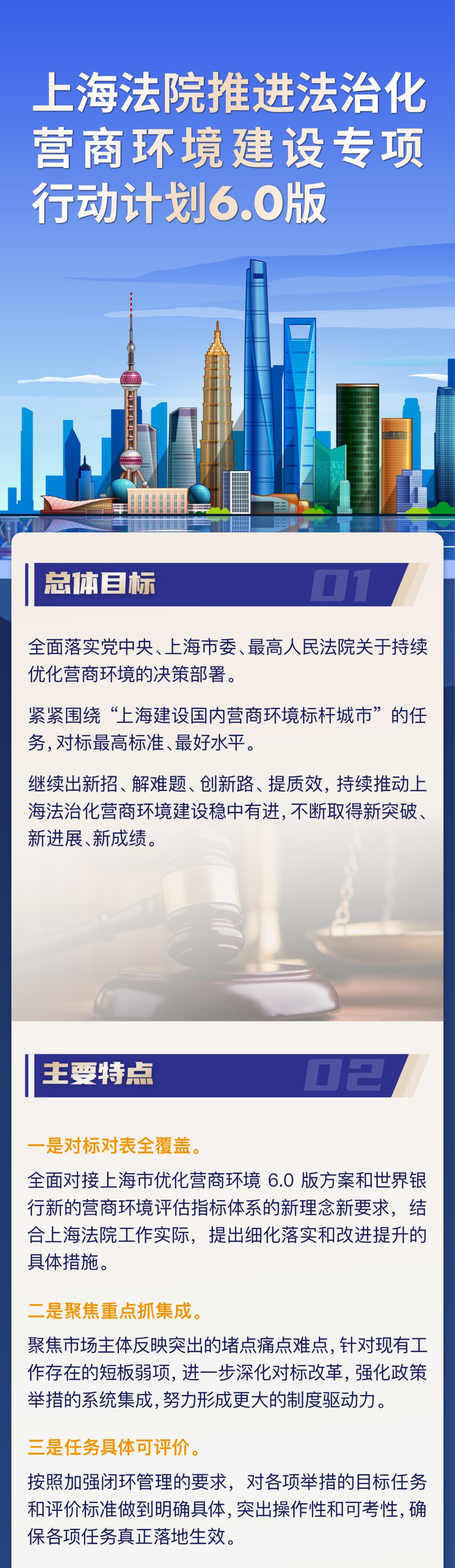 市高院介绍,自2018年起连续5年推出上海法院推进法治化营商环境建设专项行动计划,从加强产权保护、推进诉讼全流程电子化改革、优化司法绩效公开、完善破产配套机制等方面陆续推出104项改革举措,取得较好成效。近期印发实施了《上海法院推进法治化营商环境建设专项行动计划6.0版》。《6.0版计划》有何目标,特点,举措,亮点?来看图解↓