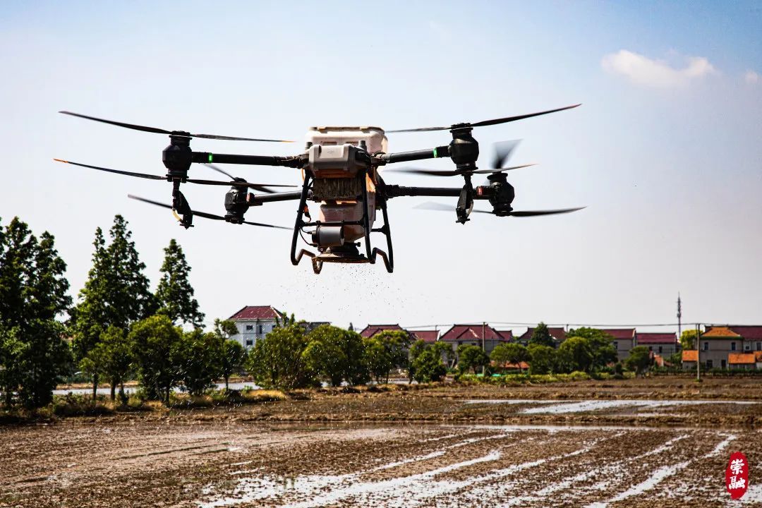 在新村乡上海聚霞粮食种植专业合作社的水田里,直播机装载着一盒盒水稻种子来回穿梭,所过之处,一簇簇种子被播撒进土壤里。一旁,伴随着旋翼的嗡鸣声,搭载着肥料的农用无人机迅速升空,在技术人员的操作下,盘旋于水田上空来回施肥。