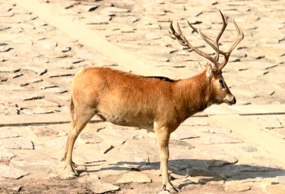 麋鹿,是国家一级重点保护野生动物。因为它头脸狭长像马、角像鹿又与其它鹿略有不同、蹄子宽大像牛、尾细长像驴,因此民间又俗称“四不像”。