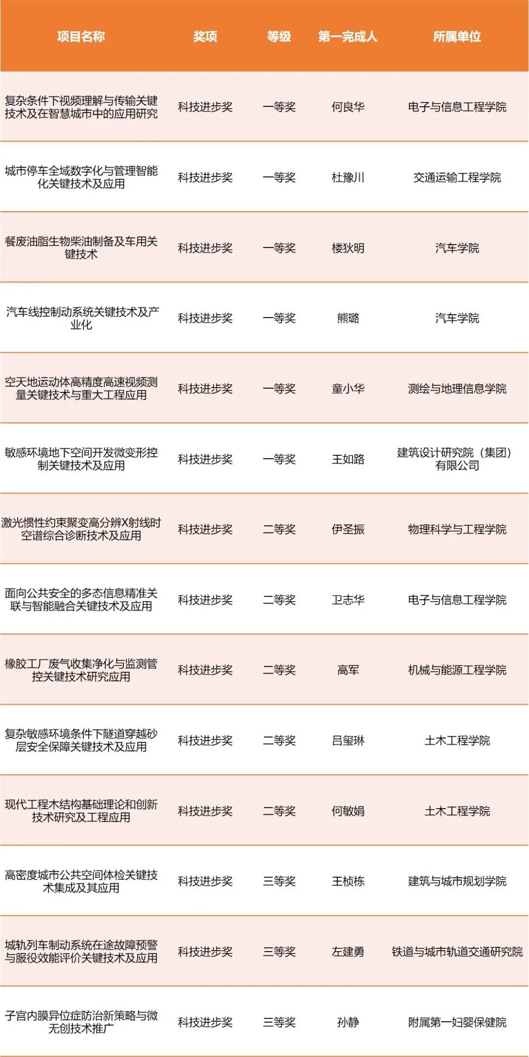 获科技进步奖一等奖6项,分别是电子与信息工程学院何良华主持完成的“复杂条件下视频理解与传输关键技术及在智慧城市中的应用研究”、交通运输工程学院杜豫川主持完成的“城市停车全域数字化与管理智能化关键技术及应用”、汽车学院楼狄明主持完成的“餐废油脂生物柴油制备及车用关键技术”、汽车学院熊璐主持完成的“汽车线控制动系统关键技术及产业化”、测绘与地理信息学院童小华主持完成的“空天地运动体高精度高速视频测量关键技术与重大工程应用”、建筑设计研究院(集团)有限公司牵头完成的的“敏感环境地下空间开发微变形控制关键技术及应用”。