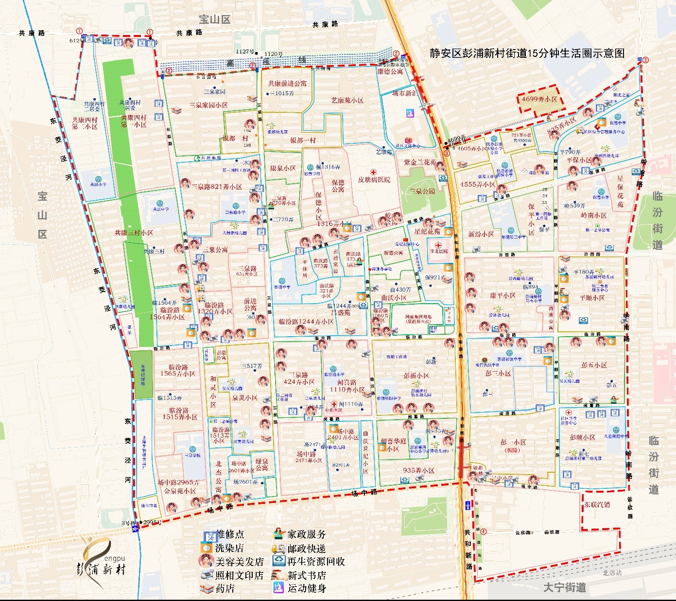 经过多年建设和发展,彭浦新村街道以社区居民、楼宇白领为重点,以步行15分钟为服务半径,科学规划社区商业服务设施,准确把握各类人群多元消费需求和市场供应情况,优化社区商业结构和布局,以商业服务提升带动社区整体品质提升,构建“一轴两带三区”服务布局,基本形成“幼有所育、学有所教、壮有所用、老有所养、住有所居、弱有所扶”的社区功能。