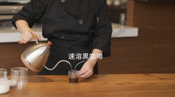 1. 用水将速溶黑咖啡冲开,用勺子搅拌,充分将咖啡和水融合在一起。