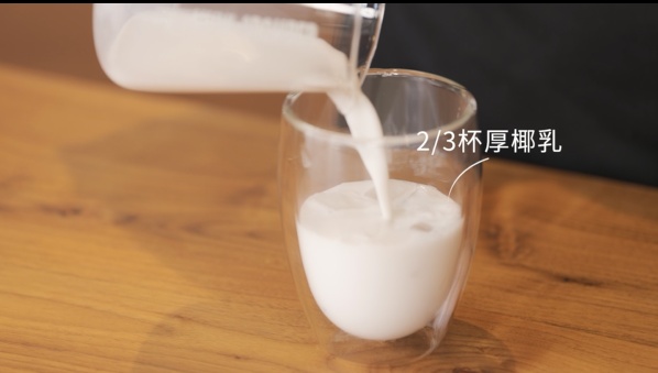 3. 在装有冰块的杯中,缓缓倒入厚椰乳至杯子三分之二处。