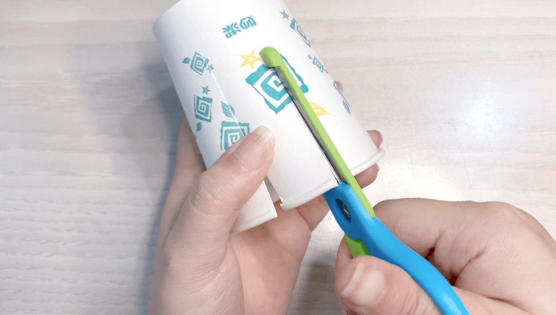 取一个废旧的纸杯,用剪刀剪出条状,注意不将之剪到底。