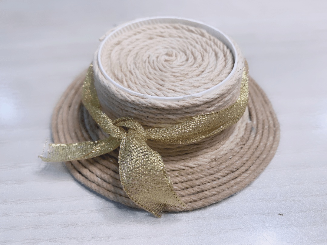 麻绳跟着杯身扩散而扩散开来做成帽檐。