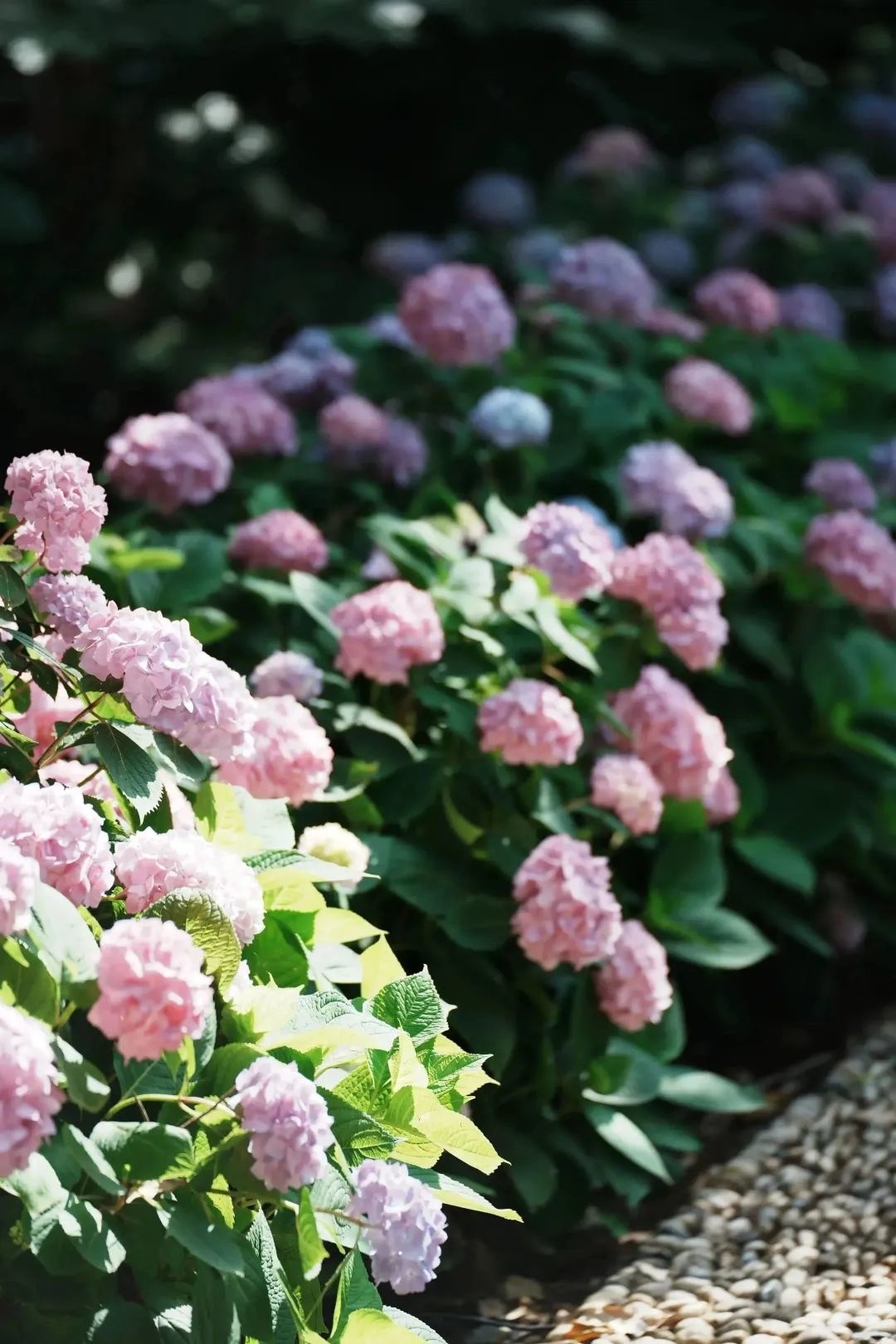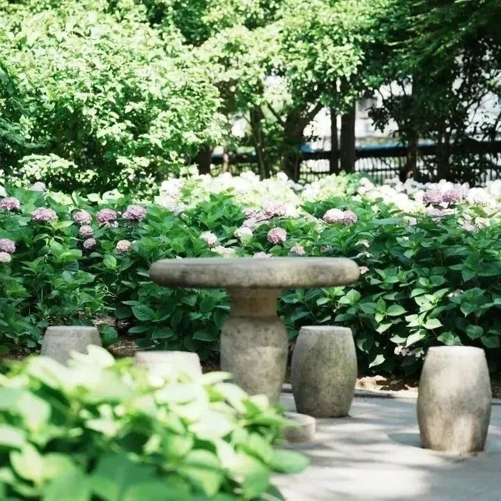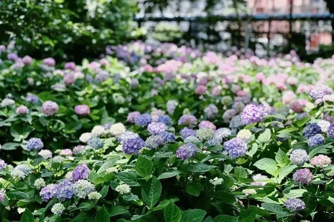 在月亮湾花园,绣球花或含苞待放,或娇艳盛开,花朵为夏日的树木葱茏增添了缤纷色彩,让绿地更具勃勃生机,简直就是行走在“莫奈的花园”之中。