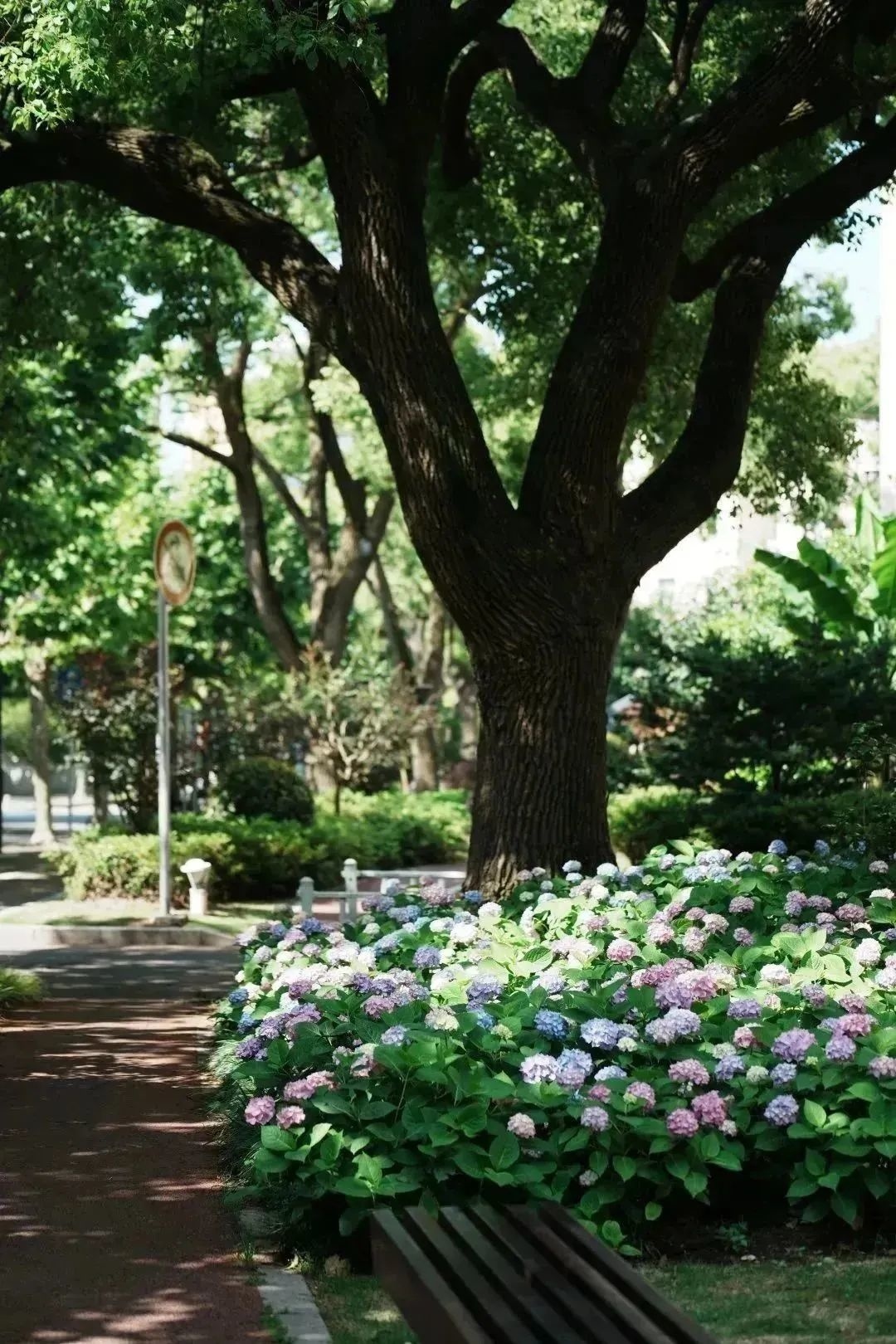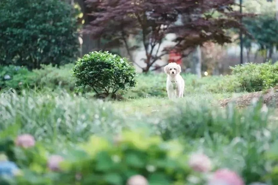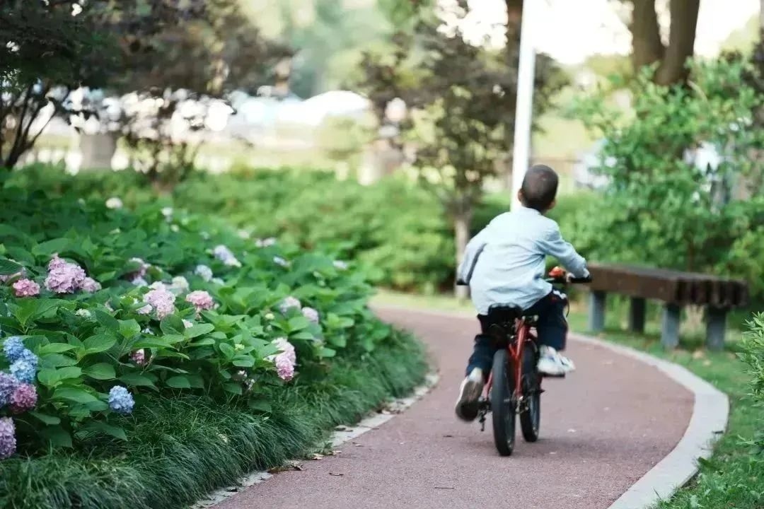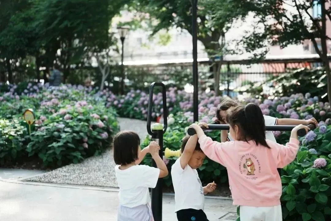 而在街心花园里,不时有居民在此散步、聊天、遛狗…… 花开在侧,风吹在旁,绣球花或蓝、或紫、或粉、或白,深深浅浅地点缀着步道两侧,连空气都变得浪漫起来。
