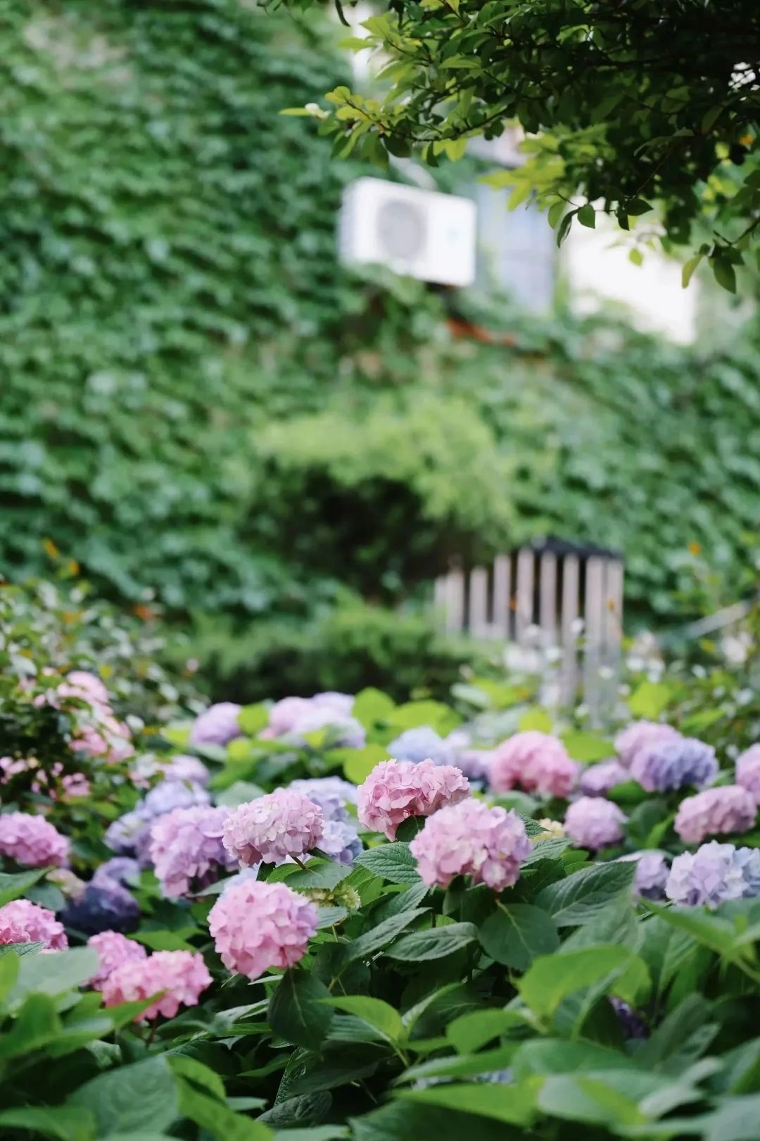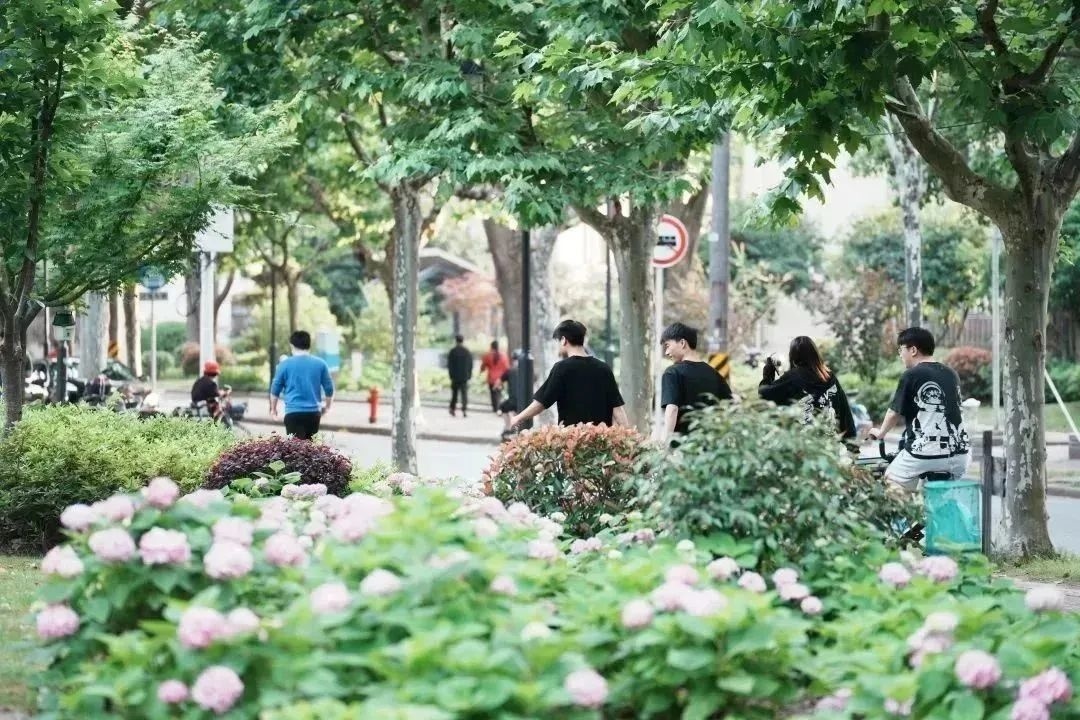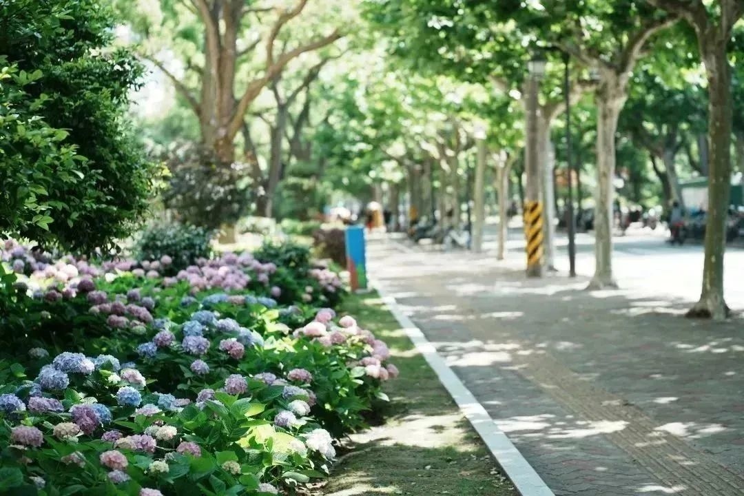 小区门口的大树、墙壁上的爬山虎,和路边粉色蓝色交错开放的绣球花相映成辉,扮靓了整条道路。