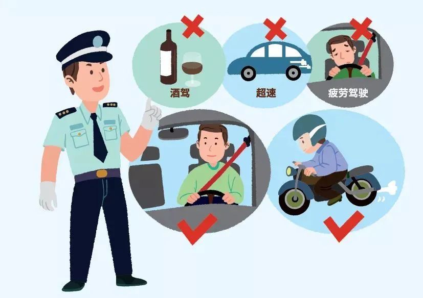 戴头盔、系安全带,不超速、不酒驾、不疲劳驾驶,减少道路交通伤害。