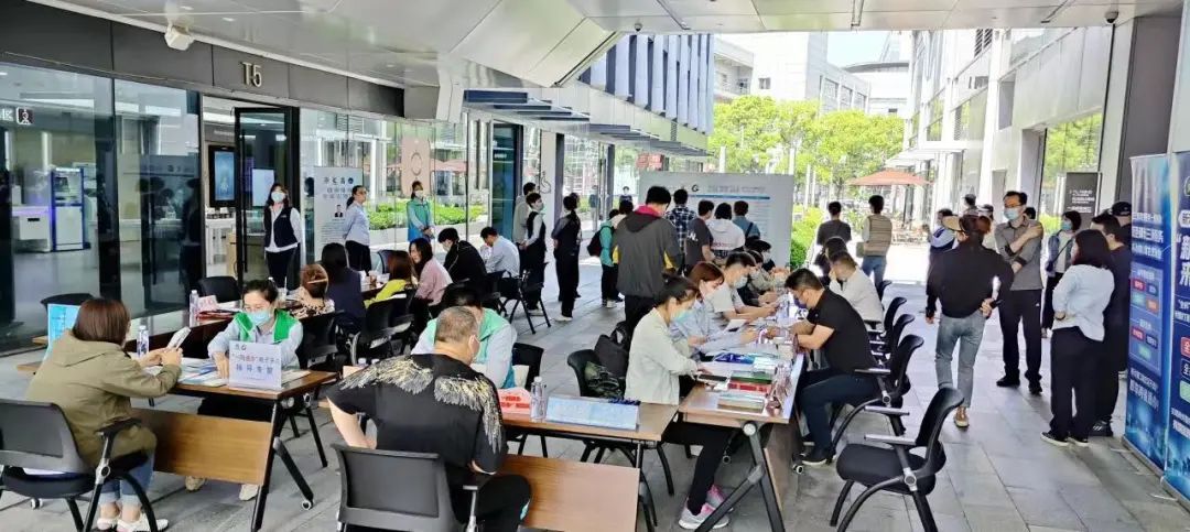 5月25日上午,长宁大融城“数字店小二”门口人头攒动,原来是新泾镇社区事务受理服务中心正在举办2023年“百城万企”促就业专场招聘会。