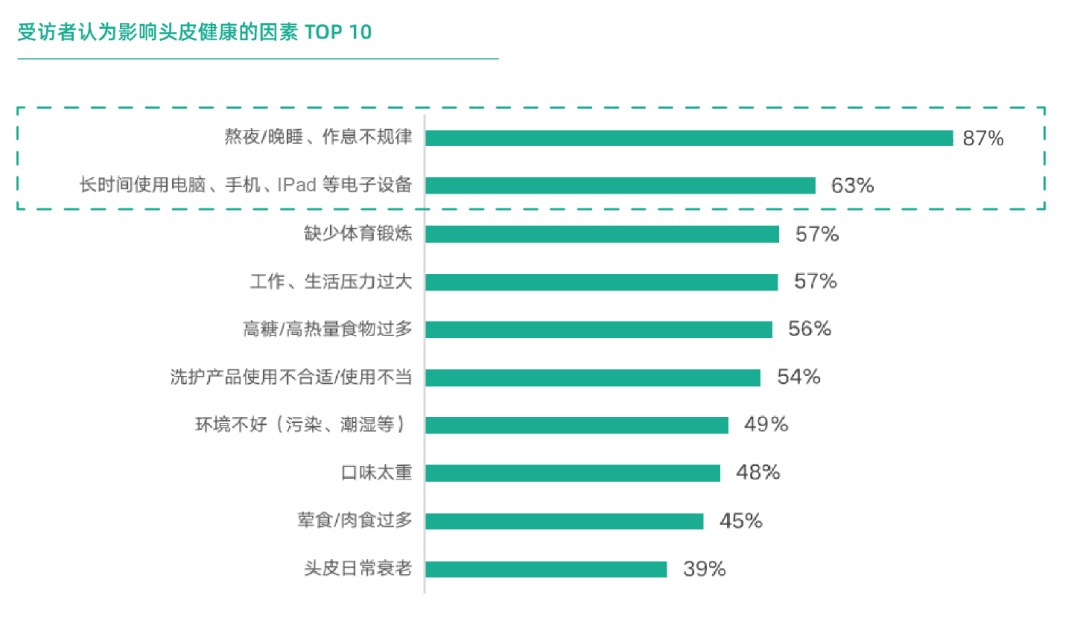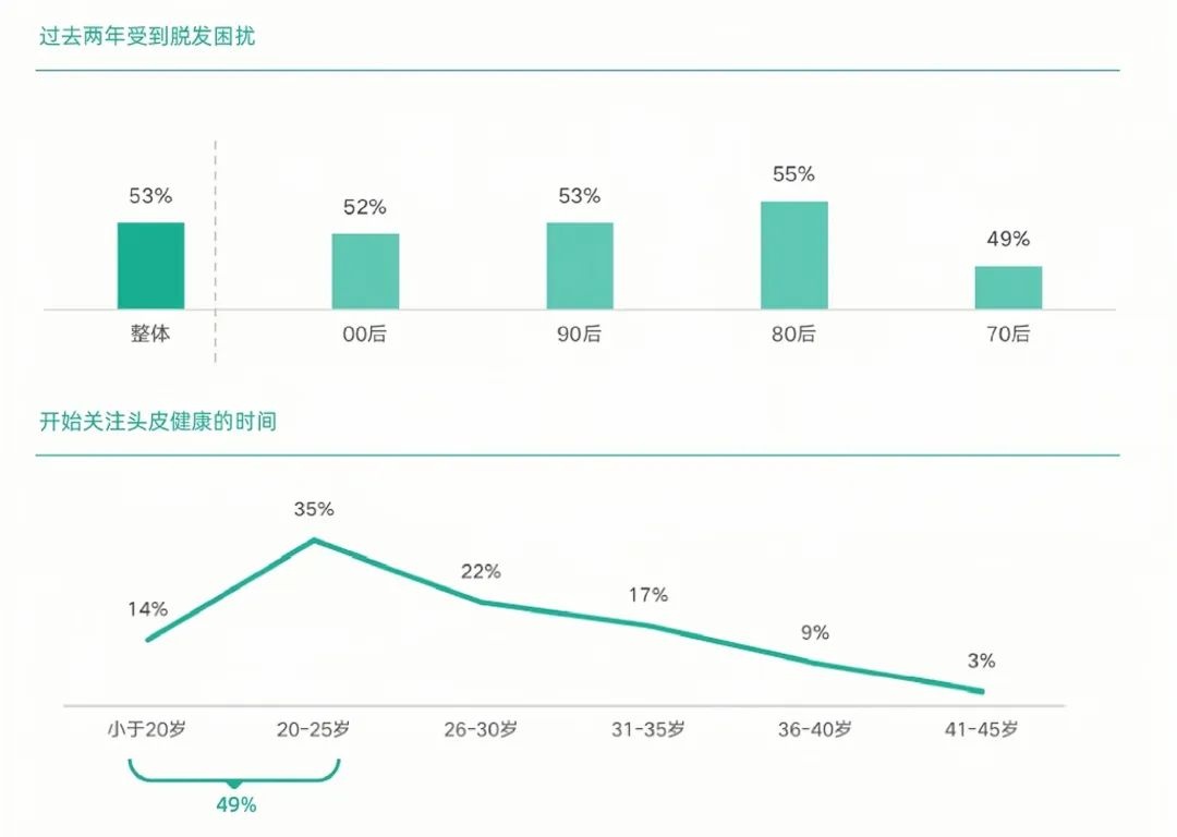 《2022都市人群毛发健康消费白皮书》显示,随着生活方式的改变,晚睡、长期使用电子产品等原因,超五成人群受到脱发困扰,值得注意的是,52%的“00后”已有脱发困扰,20岁前就有头皮“忧患”意识的占比14%,头皮健康问题低龄化、脱发年轻化的趋势日益明显。
