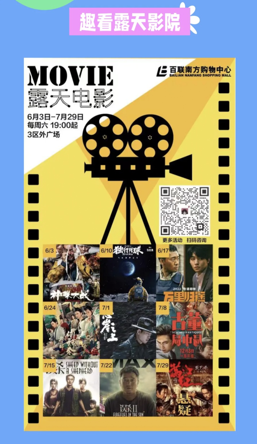 临近六一节,百联南方还将推出一系列充满童趣的文艺活动。6月3日至7月29日期间,每周六19:00,室外露天电影院将安排精彩大片上映!《独行月球》《悬崖之上》《误杀》……一边重温旧日情怀,一边欣赏爆火热片,快来参与吧!