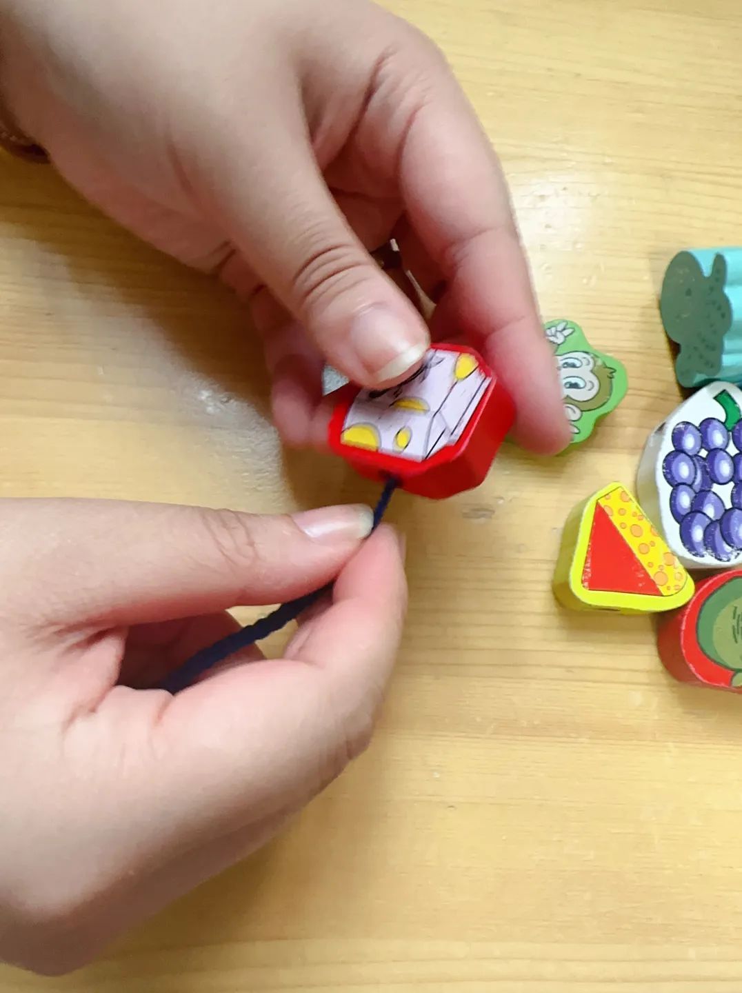 穿珠、穿针引线……让孩子不断练习穿不同质地、不同颜色、不同大小和形状,或洞眼大小、深浅不一的珠子,或用吸管、硬纸片剪成的“珠子”等,同时穿珠所用绳线之软硬、粗细等也可有所不同。