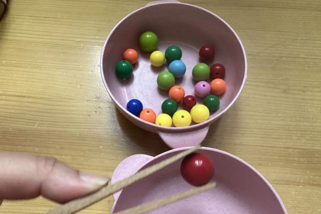 用筷子夹食物,用圆盘衣架夹袜子……让孩子坚持使用筷子吃饭,经常用塑料夹子玩夹一夹的小游戏等。