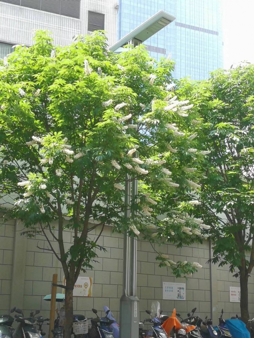 七叶树属无患子科七叶树属,是落叶乔木。树形优美,观叶、观花、观果皆可,与悬铃木、榆树、椴树并称为世界上四大优美行道树。区绿化中心相关负责人介绍,七叶树是市局近年来推广的新优行道树品种,徐汇将昭平路作为试点路段,在前几年道路施工时配合进行了栽种。七叶树喜光,稍耐阴,喜冬暖夏凉的气候和湿润、深厚及排水良好的土壤,在瘠薄和积水地生长不良,在酷暑烈日下树皮易遭日灼危害,较耐寒。同时,由于七叶树是开花植物,所以对水肥的要求会比悬铃木要高,且易生病虫害,目前仍在试点阶段。