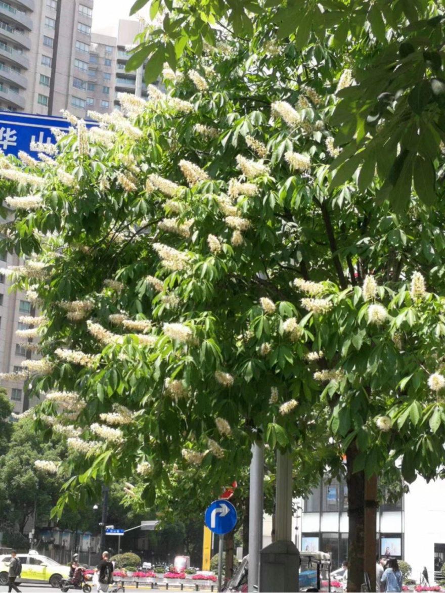 明代顾起元在《客座赘语》中讲道:“今南中有娑罗树,树直而多叶,叶必七数,一名曰七叶树。初夏作花,花挺出于枝上,长数寸,茎紫青色,一茎数十花,花色白,结实如栗。”说的就是这种七叶树。通常情况下,五月初,七叶树开始进入花期,这会儿,花开得正旺,硕大的花序似一盏盏华丽的大烛台,颇为壮观。