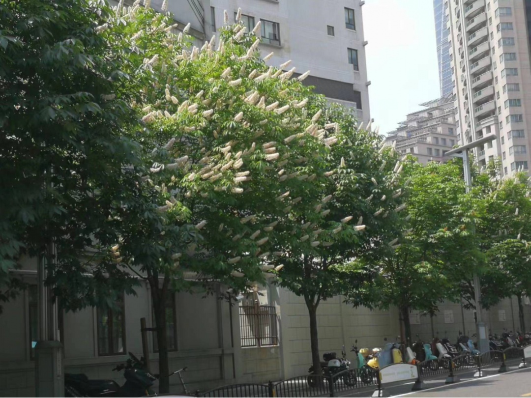 近日,走在徐家汇商圈昭平路的市民被行道树上支棱起的一个个“小烛台”吸引,纷纷驻足拍照。记者自区绿化市容部门了解到,原来是又到了七叶树开花的时节。