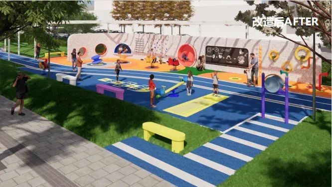 东侧靠航中路入口的小广场,圆形铺装、圆心绿地、线条简洁的时尚雕塑,趣味互动背景墙,可供居民停留休憩的景观座凳。同时绿地考虑到居民健身生活需求,沿路设置了不同功能的户外健身器材与儿童游乐区,以此打造一个亲子游玩、互动娱乐、趣味运动的缤纷欢乐空间。