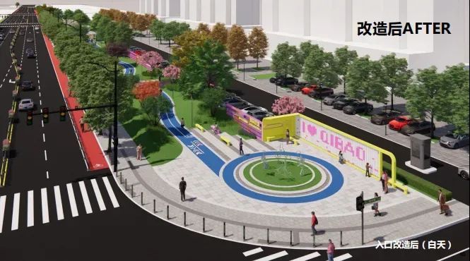 西侧邻航西路入口空间规划了非机动车停车区域,通过绿篱、乔木的配置形成绿色生态停车空间,为骑车通勤地铁换乘的市民提供便利的同时也规范停车管理。